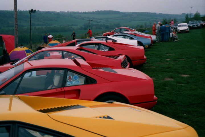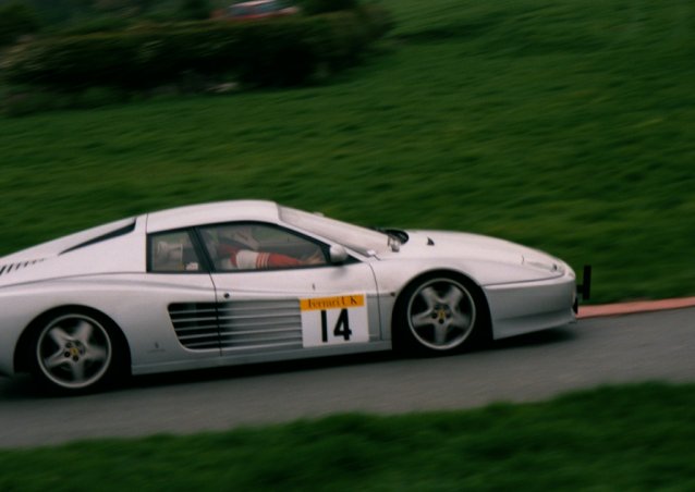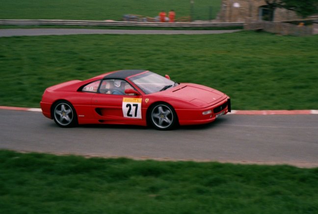 FERRARI HILLCLIMB CHAMPIONSHIP Morning practice was already a tense affair, with Ward posting a splendid 67.65 on his first run, but this was then bettered by Goodwin, who lowered the practice best to a 67.02. The first of three competitive runs saw Goodwin on top by a small margin, despite losing time by getting on to the grass at Willow. He was closely followed by Richard Allen (the FHC's "Bernie"), Clark and Ward. There was some controversy, as both Allen and Clark's official times were declared by the time-keepers to be better than appeared on the digital display. Other first run highlights were Brian Jackson carrying considerable speed into the tricky Farmhouse bend in his 308GTB, Len Watson taking the class lead in his 328GTS, until the "top 4" displaced him and Peter Hayman's skilful handling of his 512TR. Though not at first sight ideally suited to hillclimbing, the big car made a welcome change from the ubiquitous "3" series', sounding glorious and recording the fastest speed of all (81 mph) on the short straight. However, on his third run the substantial piece of Italian engineering which had enabled this high speed made its presence felt in the tightening radius of Yorkshire tarmac known as Quarry, flicking the car into oversteer, but Hayman held it well, taking eighth in class. Warmer conditions for the second runs resulted in improved times for many. Michael Spicer was trying hard in his 308GT4 and locked his brakes up going into Farmhouse bend, but still improved by over a second. Occasional PMFC racer Terry Esom was very aggressive, which resulted in a substantial 2.5 second improvement to 70.36. As with most, he went on to record his best time (70.24) on his third run. Simon Clark and Robin Ward were both red-flagged on their second runs. On his re-run, Clark improved to 67.38, which eventually left him second overall. Ward was trying very hard, tyres squealing, to make up for the power deficiency of his 308 against the bigger engined cars on this high-speed hill but went off in a big way at Quarry. This left a sill dangling, which was quickly fixed by attention from many helpers. Jon Goodwin was visibly quicker than the rest, his 66.47 in the raucous 355 eventually proving to be the winning time. On the third runs a hard-charging Ward improved to 67.58 but this still left him third in class. Clark's third run time was suspect, he was offered a re-run which he graciously declined, magnanimous in defeat, leaving the day to Goodwin whom he felt he could not have caught anyway. Goodwin failed to improve, but the day clearly belonged to him. His second run time broke the class record as stated in the programme, but this is incorrect with the record still standing to Christian Mineeff at 66.25. Richard Allen finished in a strong fourth place in his 328, with Len Watson, in fifth, being the only other runner under the 69 sec mark. John Marshall, in the 328, rounded off the top six. Thus ended the first part of an excellent day, the racers and their entourage later repairing to the Harewood Arms for the customary bun-fight. Special thanks to JCT 600 who generously provided a delicious barbecue for the FHC and the true heroes of British motorsport - the trackside marshals. With the PEP percentages applied Clarky took home the maximum 20 points, followed by Ward, Allen and Robin Ashley, who put in a superb time in his lovely Dino GTS. Overall, after three rounds Ward has a handy lead over John Marshall and Richard Allen.